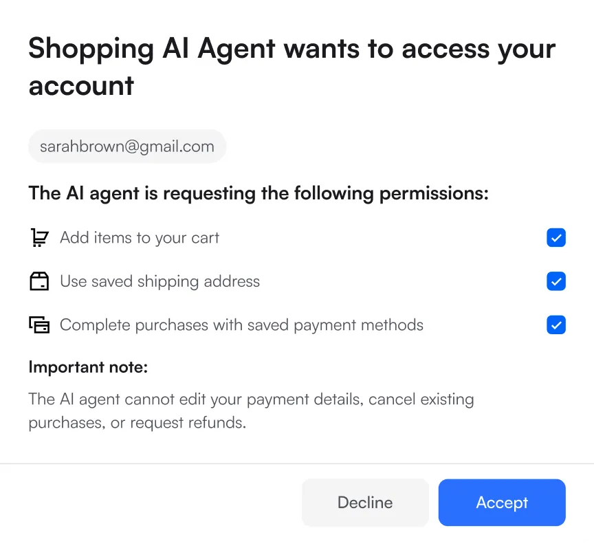 In multi-store environments, shared AI agents can act safely across multiple merchants. Because each merchant can instantly verify the agent’s credentials, the agent can manage recommendations, apply verified discounts, complete checkouts, and handle fulfillment across stores as if it were a single, unified marketplace. The result is a seamless, personalized shopping experience across an entire ecosystem, without repeated logins or re-verification.