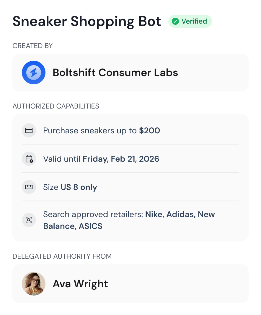 Define granular, time-bound permissions using delegated-authority credentials. You can control spend limits, merchant scope, data-access rules, and expiry. Access can be revoked instantly without updating code or invalidating entire systems.