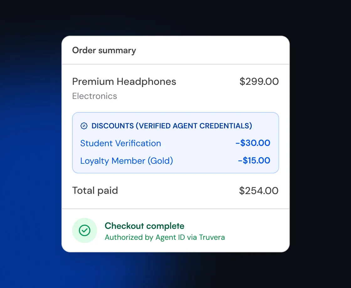 When the agent initiates a payment, the merchant or platform verifies its credentials instantly through the Truvera API.